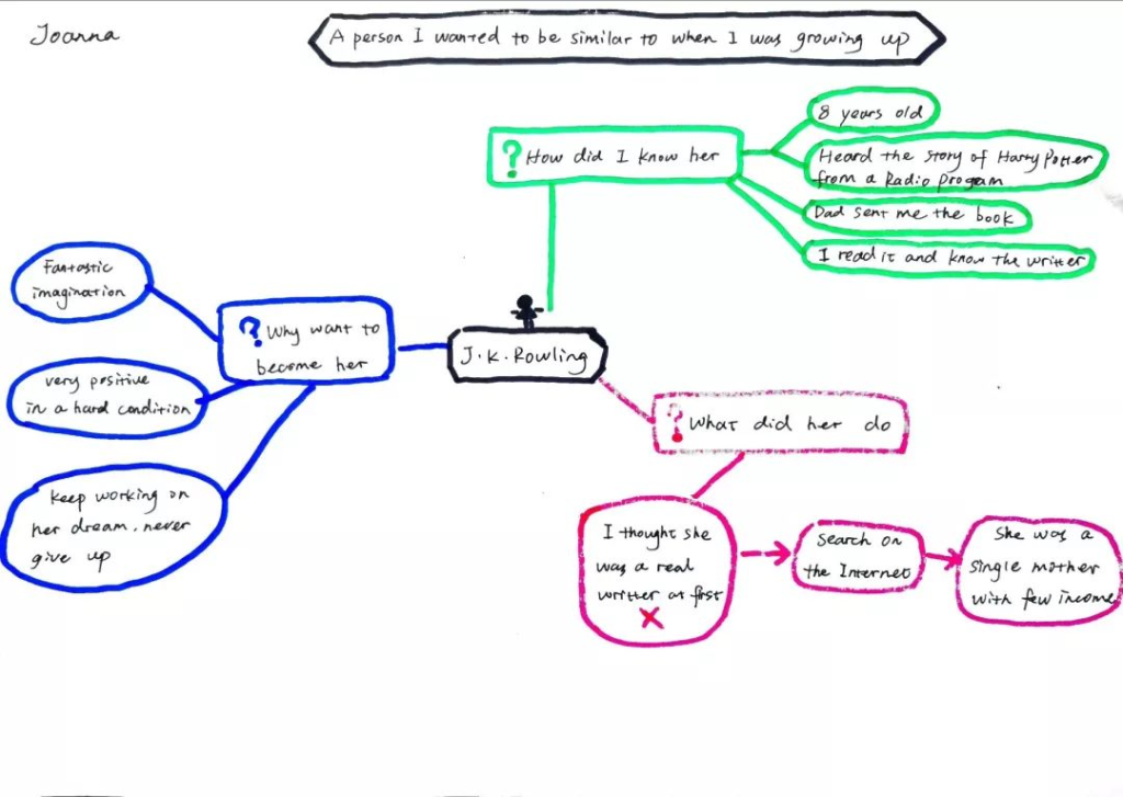 在课前,同学们根据Daisy给的视频资料和文字资料,总结了自己喜欢的一个名人的生平,同时找出他们成功的理由。并且,他们每个人都画了一个思维导图,画出了他们是思考“person”这个话题时的思路。