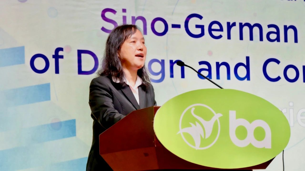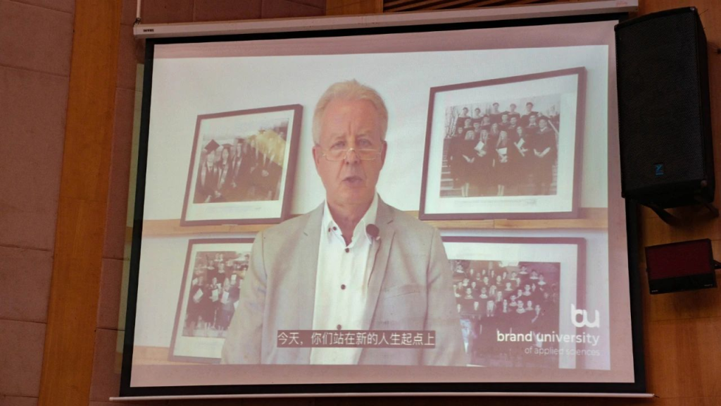 本次典礼由党总支书记丁亚军主持。浙江万里学院副校长、中德设计与传播学院院长钱国英教授、德国品牌应用科学大学国际学术主管Stefan Waller教授、教师代表高迪老师、19级学生代表和20级新生代表上台发言。德国品牌应用科学大学的副校长Stefan Haarhaus教授通过视频的方式,从德国送来了对新生们的期待与祝福。