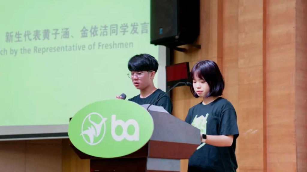 2020级新生代表金依洁与黄子涵表达了自己在学习路上一往无前的坚定信念,并希望与全体新生们共许愿望,在努力奋进的学习过程中成为自信成熟、包容多元的中德人、万里人。