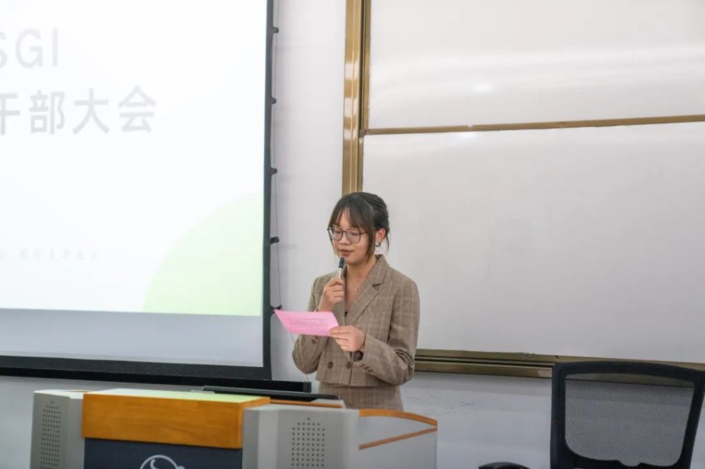 学生会代表郑茜同学分别从“踔厉奋发,构建多元型组织”、“履方致远,开拓国际化域程”、“盎然笃行,赓续立新式蓝图”三个方面对上一年度学生部组织开展的活动展开汇报讲解。