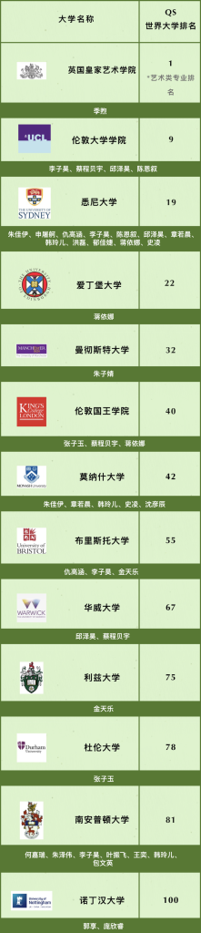 中德品牌学部4个专业已有共32位同学海外申研成功,其中60%斩获QS世界大学排名前50 的名校录取通知书,包括伦敦大学学院(QS世界大学排名第9位)、英国皇家艺术学院(QS世界大学排名艺术设计类第1位)、悉尼大学(QS世界大学排名第19位)、英国爱丁堡大学(QS世界大学排名第22位)、英国曼彻斯特大学(QS世界大学排名第32位)、伦敦国王学院(QS世界大学排名第40位)、莫纳什大学(QS世界大学排名第42位)等世界知名大学。