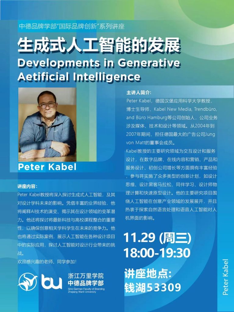 讲座内容:Peter Kabel 教授将深入探讨生成式人工智能,及其对设计学科未来的影响。凭借丰富的业界经验,他将阐释 AI 技术的演变、揭示其在设计领域的变革潜力。他还将探讨将最新科技与高校课程整合的重要性,以确保创意相关学科学生在未来的竞争力。他也将通过实际案例,展示人工智能在各种设计项目中的实际应用,探讨人工智能对设计行业带来的挑战。