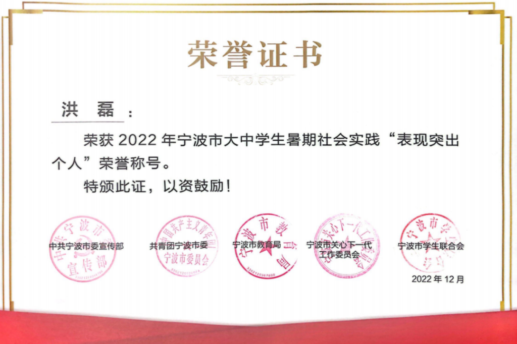 2021年11月获宁波市大学生“双百双进”暑期社会实践优秀团队