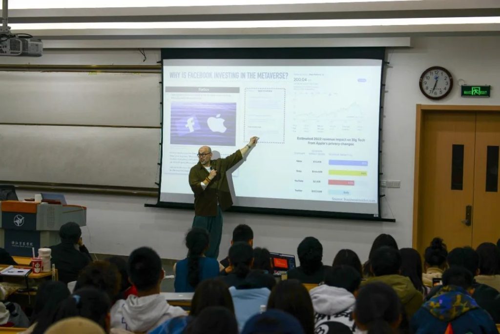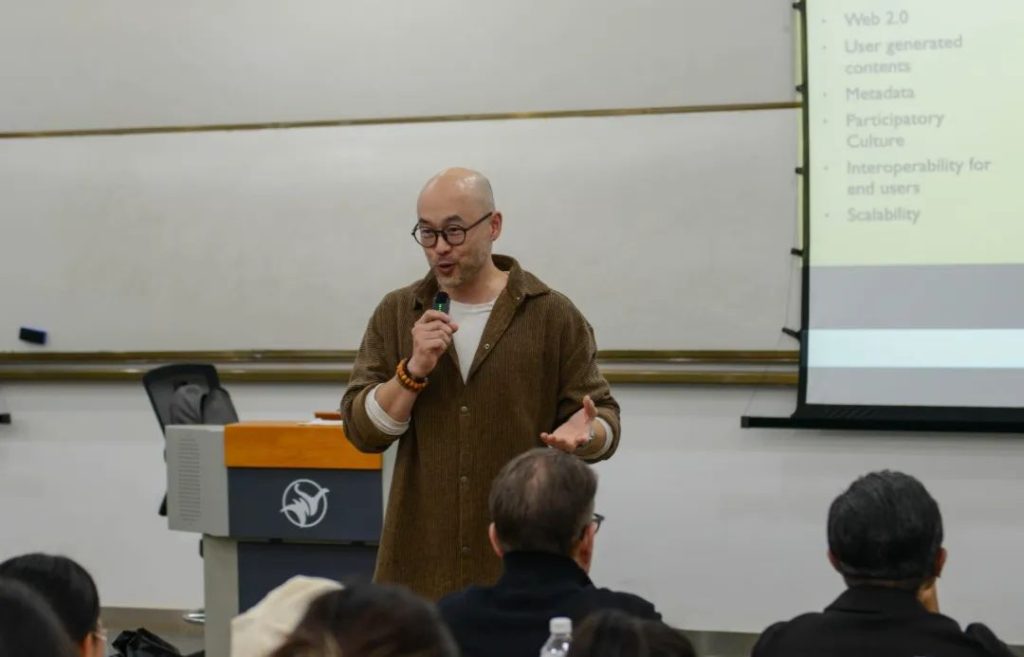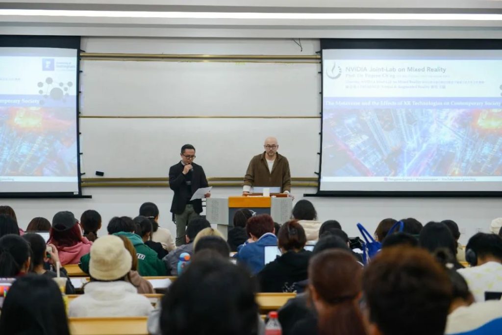 宁波诺丁汉大学教授,英伟达(NVIDIA)混合实境技术联合实验室主任、麻省理工学院出版社《Presence: Virtual and Augmented Reality》期刊主编庄以仁(Eugene Ch’ng)教授来到中德设计与传播学院,就元宇宙和混合现实技术如何影响当代社会这一问题为学生进行深入讲解,讲座由院长张宜平主持。