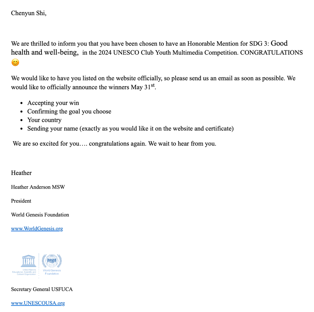 史晨昀参赛作品在SDG 3: Establish Good Health and Well-Being组别中获奖。据悉,在本次竞赛中,除史晨昀作品外,还有一件来自中国的作品获奖。