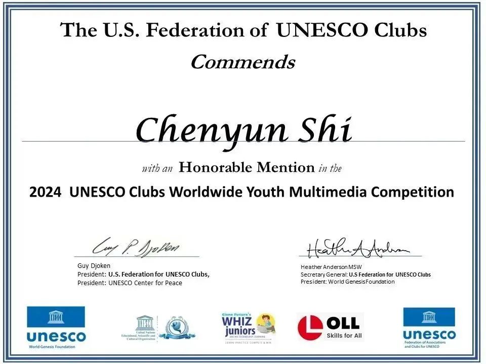 中德品牌学部史晨昀同学作品获联合国教科文组织全球青年多媒体竞赛荣誉提名奖