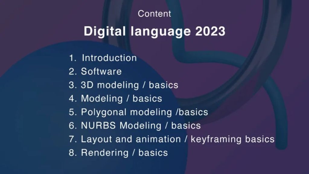 数字化造型语言(Digital Visualization Language)是中德设计与传播学院艺术与科技专业的一门必修课,由Jan Tomas教授授课,许可为老师和周莹老师担任助教。课程介绍了三维造型语言的知识与使用、Cinema 4D进行三维建模的基本技能,这其中包括多边形建模(Polygon Modeling)、曲线建模(NURBS Modeling)、画面布局、摄像机布置、灯光布置规则、时间轴动画和3D打印的基础知识。