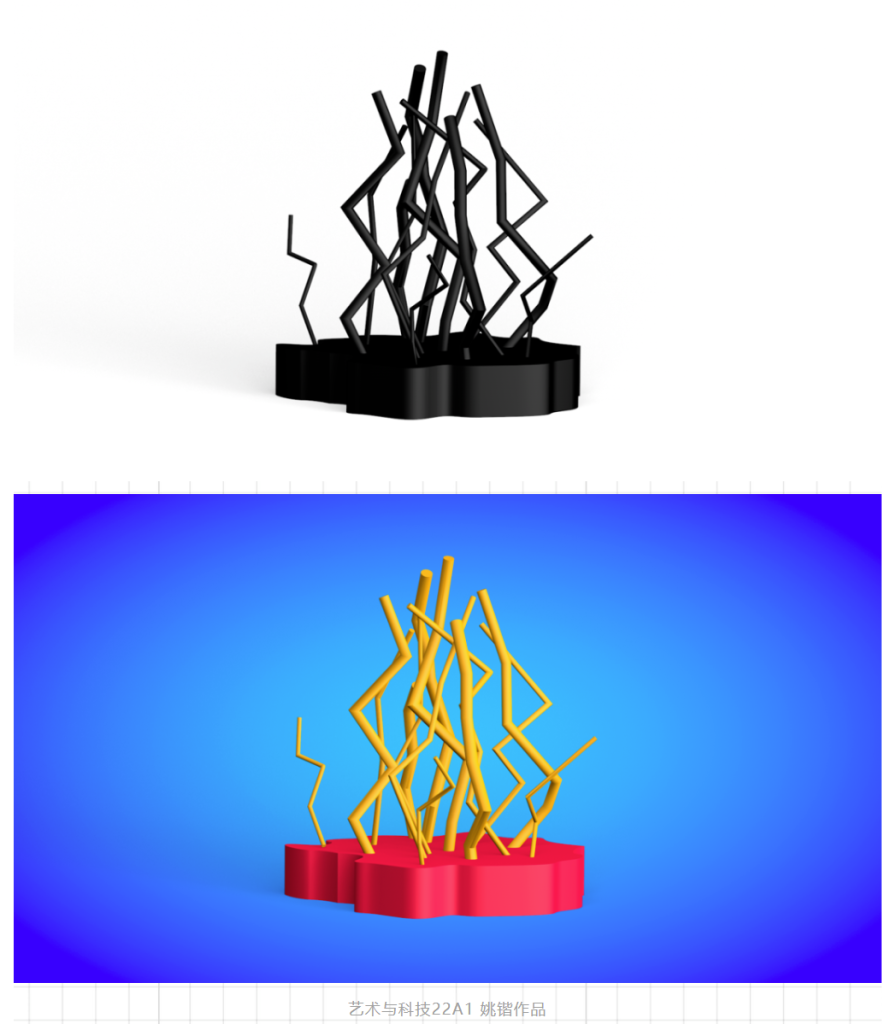 作品介绍:在我看来火是具有攻击性的能量,其燃烧和运动方向是不规则的,但总体是向中心燃烧。在我的设计当中,用较细圆柱从下而上的拐弯曲折来表现火的动势和攻击性,同时圆柱向中心靠拢。从正面和侧面看,它的外观都酷似火的造型,同时底盘也模仿了火的造型。