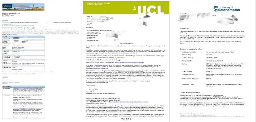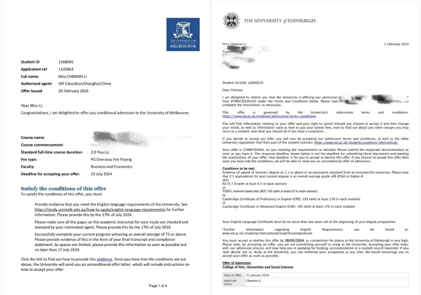 截至目前,李晨欣已经获得了University College London(伦敦大学学院)、The University of Melbourne(墨尔本大学)、University of Edinburgh(爱丁堡大学)、University of Glasgow(格拉斯哥大学)、The University of Southampton (南安普顿大学)等5所世界名校的offer