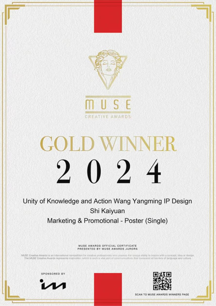 近日,全球创意领域最具影响力的国际奖项之一——美国MUSE Creative Awards 缪斯创意奖2024年度获奖名单正式公布,浙江万里学院中德品牌学部23级视觉传达设计(中外合作办学)专业学生石开元设计的“知行合一——王阳明IP设计”从众多国内外优秀作品中脱颖而出,获得金奖。