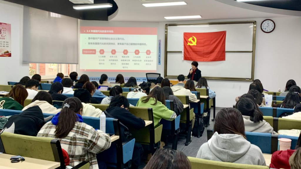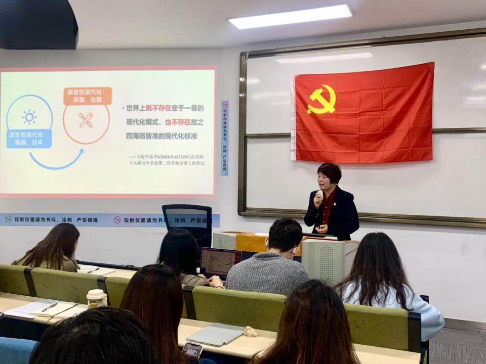 “世界上既不存在定于一尊的现代化模式,也不存在放之四海而皆准的现代化标准。西方资本主义社会较早实现了工业化及社会制度的变革,导致有人认为现代化等于西方化、现代化等于资本主义化。而通过讲座我们明白,现代化不等于西方化。”肖老师的讲解让在座的师生对“中国式现代化”有了清晰更深刻的认知。