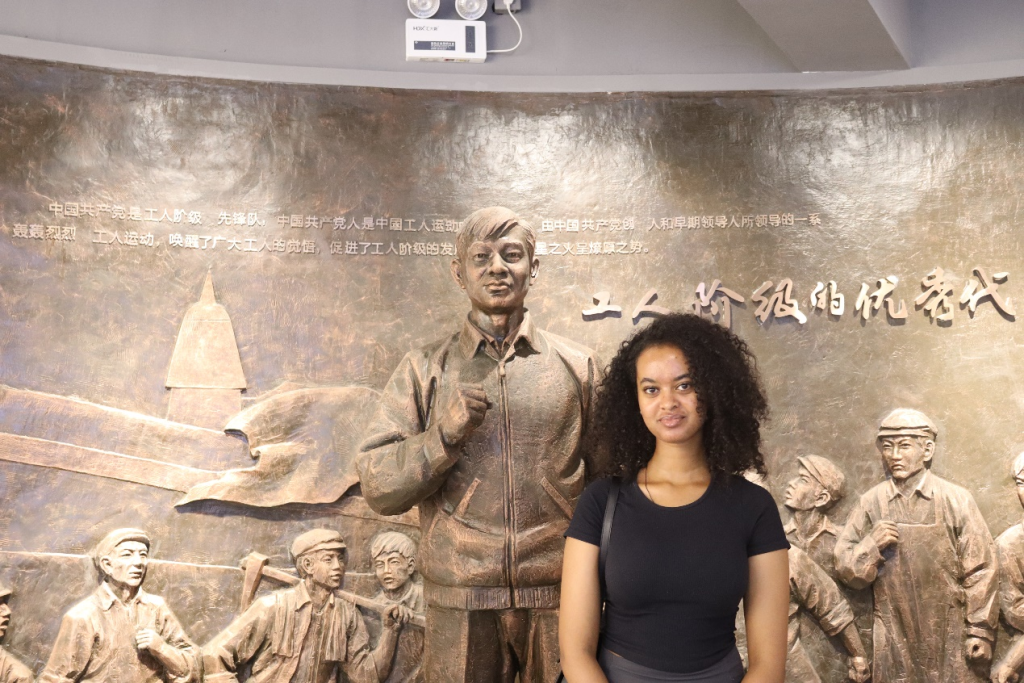 “借人头,平工潮”的残酷手段来镇压工人运动。1948年4月1日,一场阴谋悄然降临在王孝和身上。国民党特务指使假证人诬陷他在发电机中放置粗铁屑,破坏生产。王孝和尽管预感到危险的迫近,但因组织未下达撤离指令,他毅然决然地选择了坚守,恰似一位坚毅的钢铁战士,守护着自己的信仰和责任。在馆内,同学们观看电影片段时,被他在工人运动中的英勇斗争精神以及在狱中始终坚定信仰、面带微笑就义的伟大精神风貌所深深震撼。在学部同学的翻译讲解下,留学生们也被他大义凛然的革命精神所感染,眼神中流露出深深的敬佩之情。