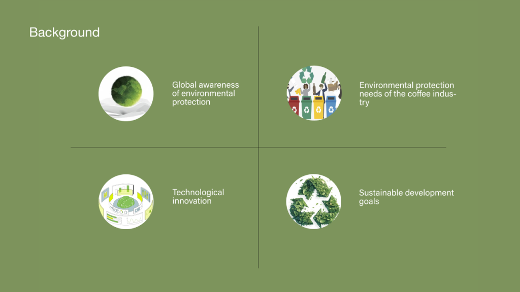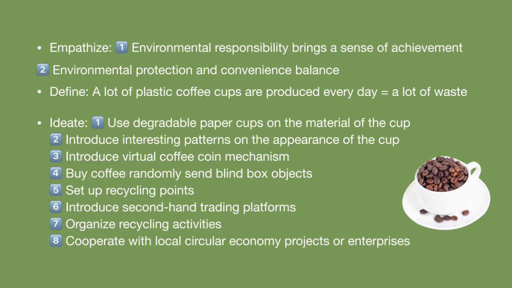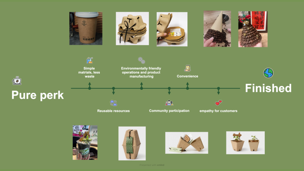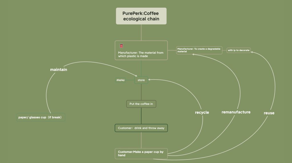 作品介绍:在快节奏的现代生活中,咖啡已成为许多人日常不可或缺的能量源泉。然而,咖啡产业背后隐藏的生态环境压力与资源消耗问题却鲜为人知,例如:咖啡杯无法分解造成环境污染。在课堂中,我们围绕循环经济和可持续发展设计了“Pure Perk”这一项目,我们致力于打造一个集绿色、公平、共享、再利用于一体的可持续循环咖啡杯项目,从一杯咖啡着手,推动社会的绿色发展。
