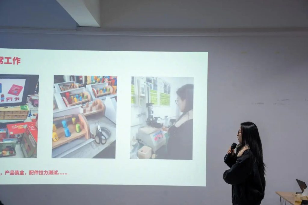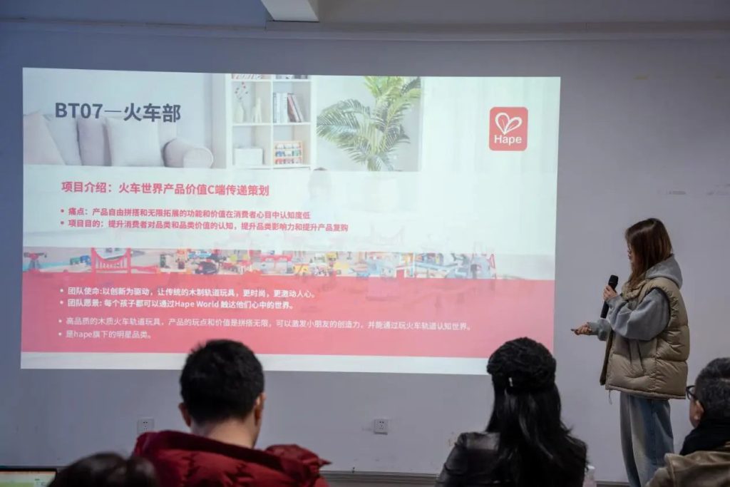 汇报现场,专班学子分组展示了他们为Hape集团设计的一系列创新产品包装、品牌宣传活动方案以及针对特定市场的营销策略等。此外,他们还分享了在Hape集团实习期间的所见所闻与心得体会,赢得了在场评委的高度评价
