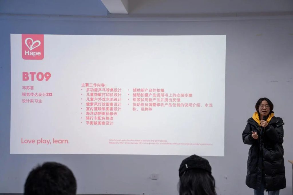 “我们针对实习学生的不同学科背景和未来发展方向,精心策划了一个综合性大项目。为了确保每位学生都能获得最适合的指导,我们还特别为他们各自匹配了一位经验丰富的实习师傅。同学们在Hape企业实习期间,面对繁重设计任务及多方建议,展现出了良好的适应性和团队协作精神我们对她们都非常认可。