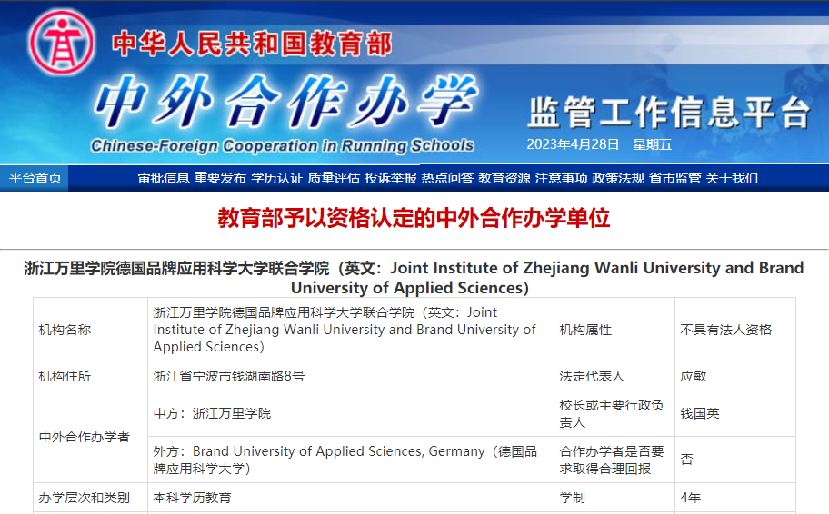 (英文:Joint Institute of Zhejiang Wanli University and Brand University of Applied Sciences)