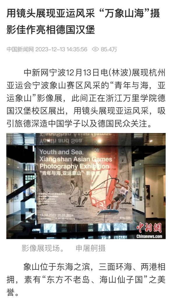 用镜头展现亚运风采 “万象山海”摄影佳作亮相德国汉堡 首页 海外交流 汉堡校区 / 2023年12月13日 文章链接:https://m.chinanews.com/wap/detail/chs/zw/10127596.shtml