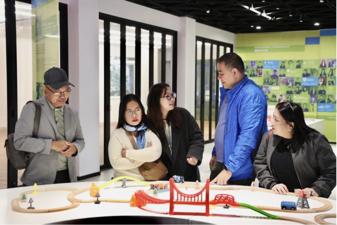 在实地参观中德9号楼展厅的过程中,来宾们详细了解了学部的发展历程、办学特色及学生优秀作品。潘羽重点介绍了学部“双元制”课程体系与校企合作项目的运行模式,该体系融合新文科课程、跨学科实践和传统文化考察,构建起立足本土、面向全球的应用型品牌人才培养路径。利帕市学校分部主管Felizardo O. Bolanos表示,学部的国际化办学理念与菲律宾教育体系当前的发展方向高度契合。